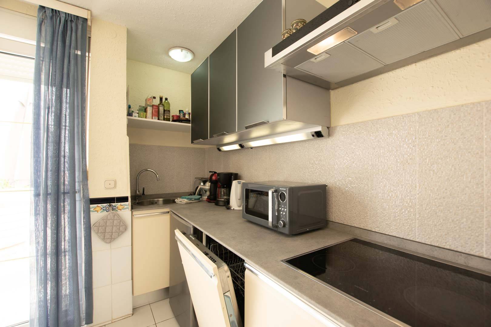Neue Küchenzeile mit 4-Platten Cerankochfeld, Dunstabzug, Spülmaschine, Kühlschrank, Kaffeemaschine, Toaster, Saftpresse, Wasserkocher und allen erforderlichen Kochutensilien.