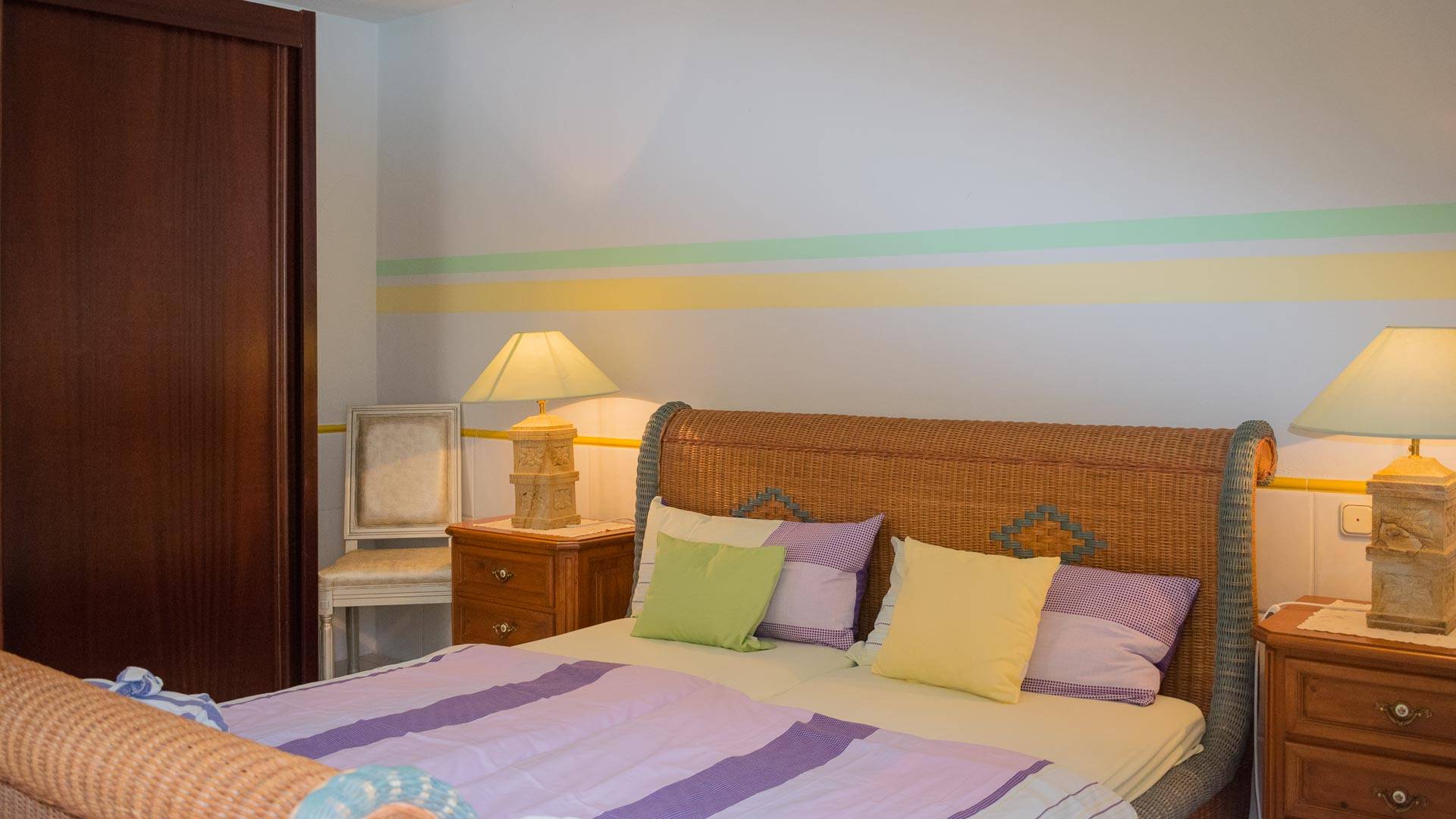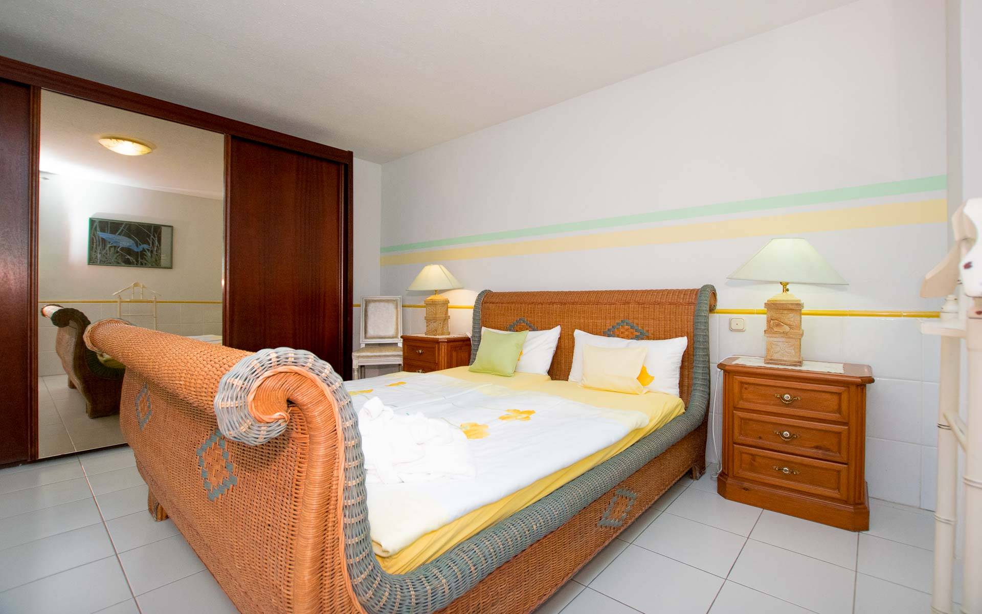 Großes Rattan Bett mit getrennten Matratzen. Wandschrank mit Spiegel Türe.