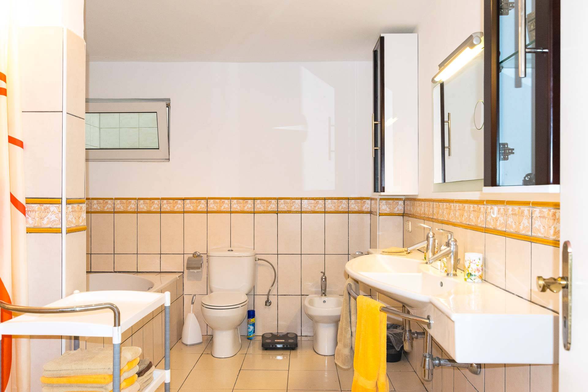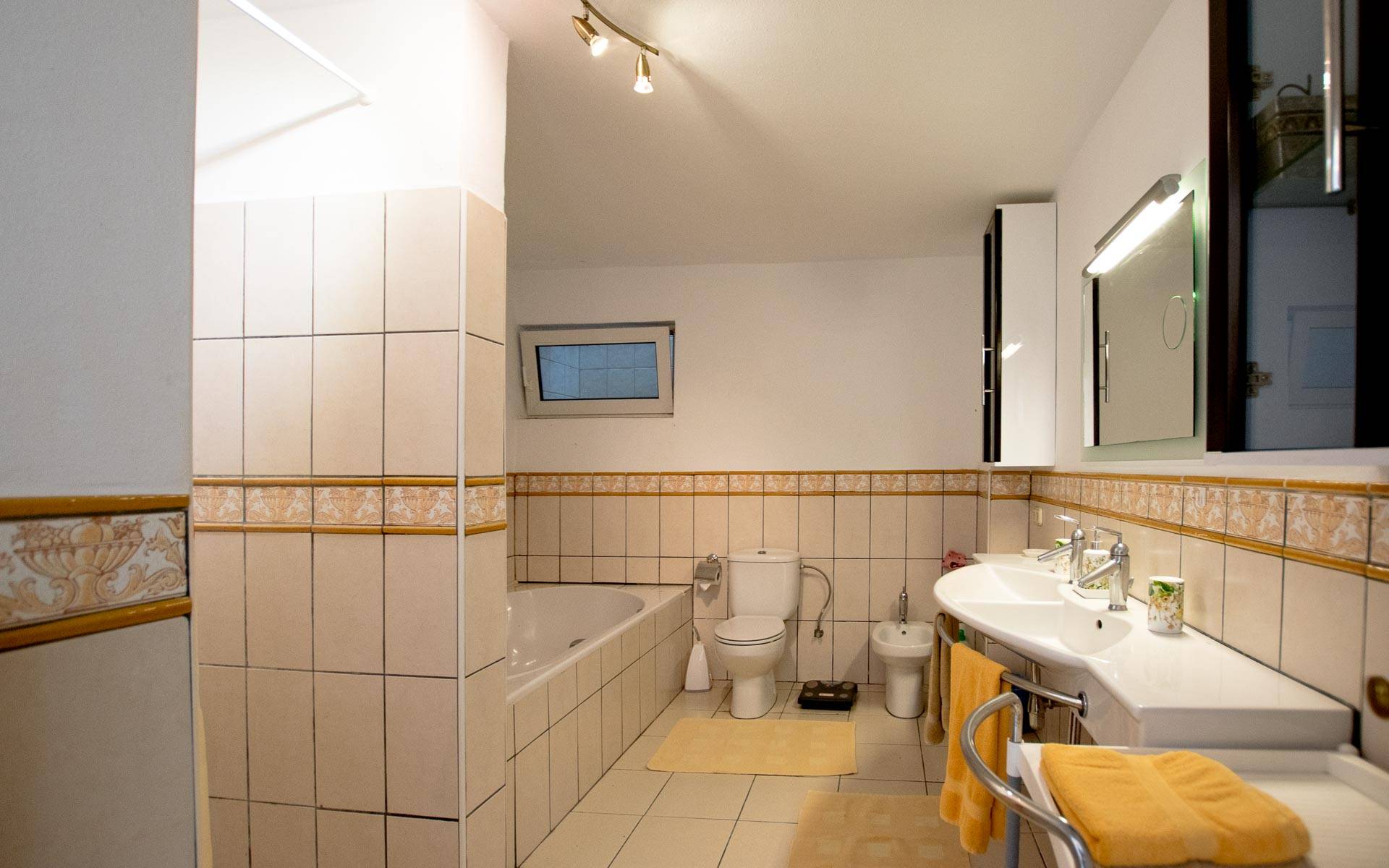 Badezimmer mit Dusche, Toilette, Bidet, Doppel-Waschbecken, Kosmetikspiegel, Föhn und 2 Bademäntel.