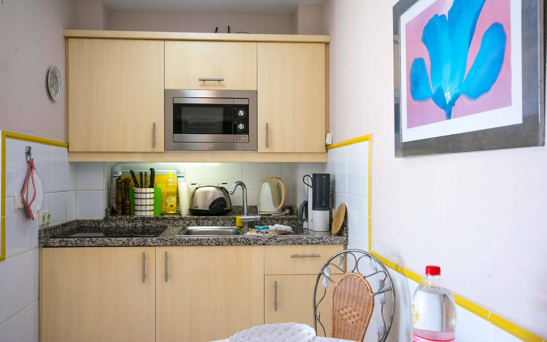 Kleine Küche mit 4-Platten Ceran Kochfeld, Mikrowelle mit Grill, Kühlschrank, Kaffeemaschine, Toaster, Saftpresse, Wasserkocher und allen erforderlichen Kochutensilien.