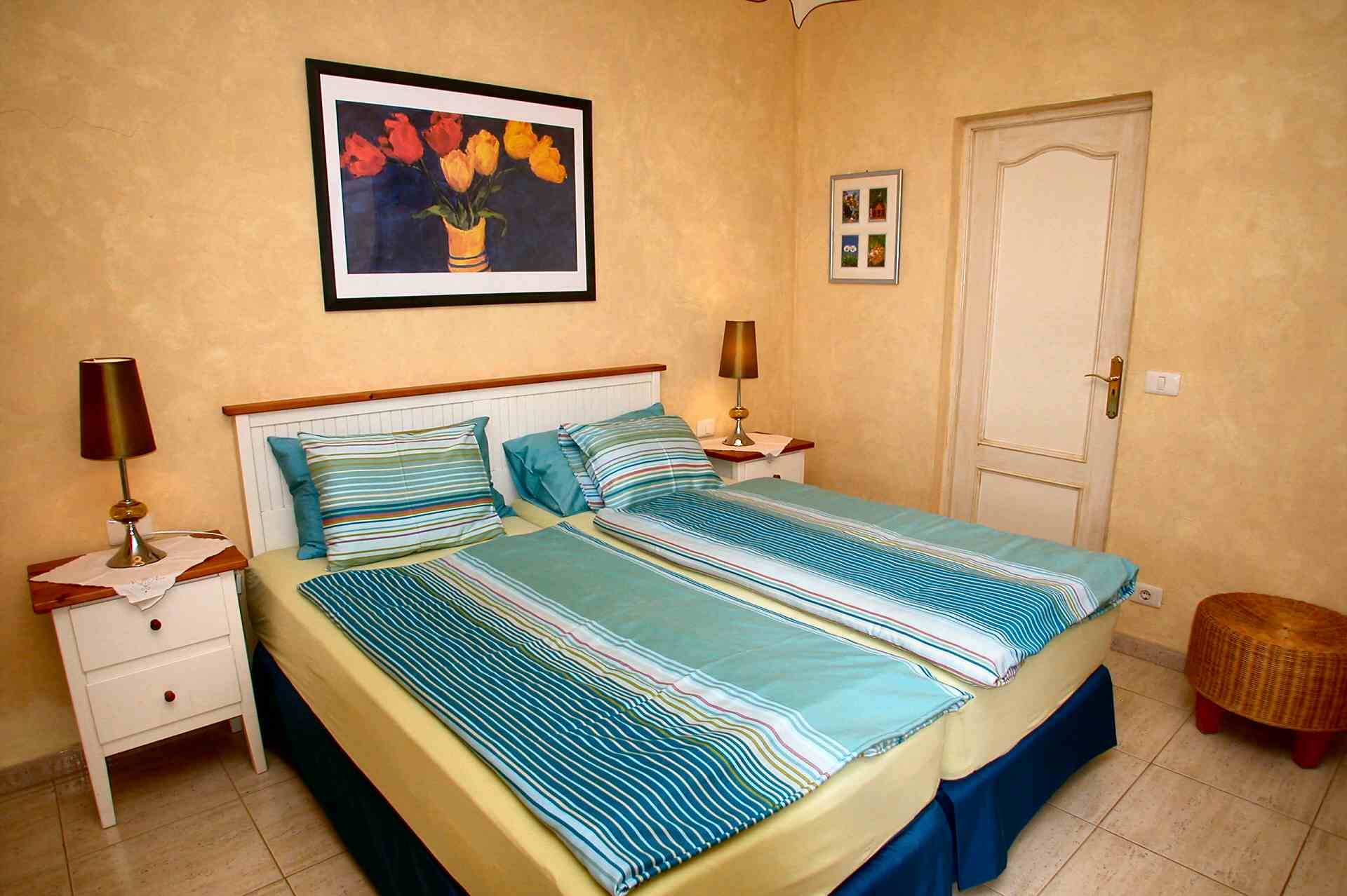2 Schlafzimmer mit je einem Doppelbett. Eines mit getrennter Matratze und eines mit einer durchgehenden Matratze.