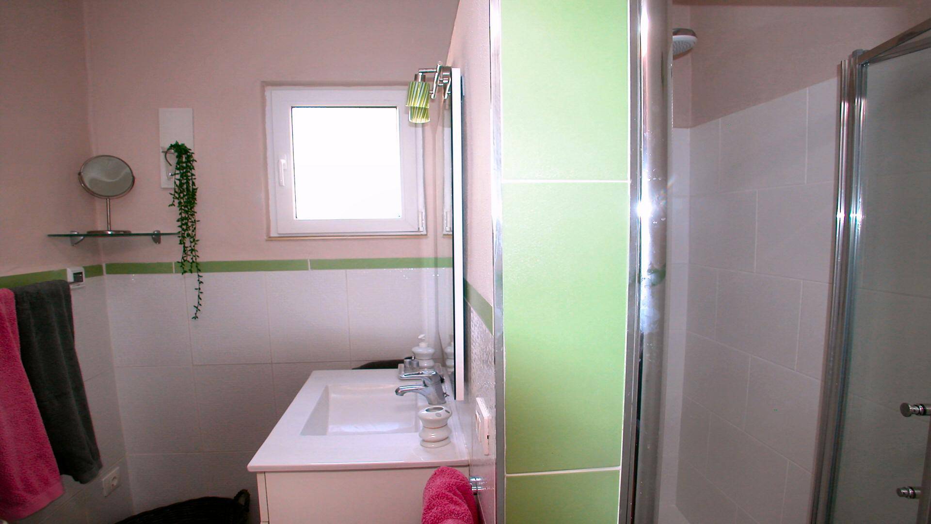 Badezimmer mit Waschtisch, Dusche, Toilette. Elektro-Heizstrahler.